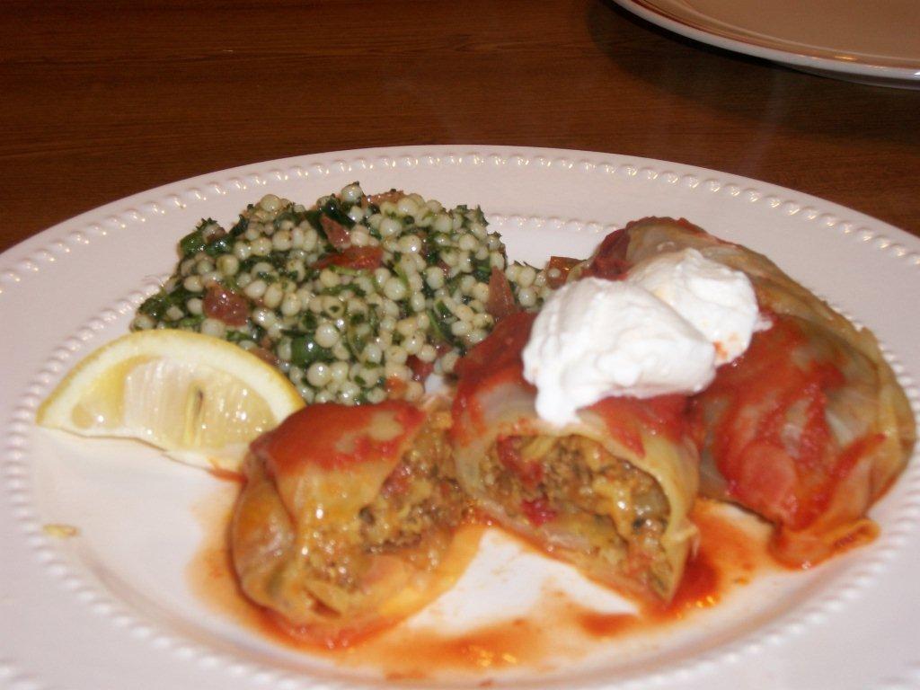 - ** This dish can be made on the stove top, use a heavy bottom pot, line the bottom with discarded pieces of cabbage. Place rolls seam side down in layers and add the lemon and tomato/water mixture. Cover tightly and simmer over a low flame until rice is tender. Test for doneness by carefully unrolling a top roll and test the rice.