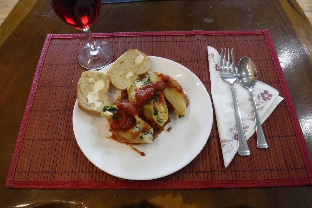 - Cover the bottom of a roasting pan or oven-proof serving dish with some of the spaghetti sauce. Arrange the filled pasta in a single layer in the pan. Pour the remaining sauce over the filed shells; the filling should be just above the level of the sauce. Bake at 350°F. for 30 minutes or until hot.